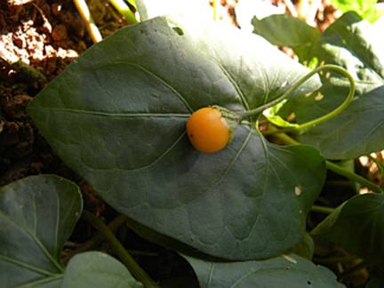 Características: Erva perene, rupícola (sobre amontoado de folhas no solo) e rastejante com ramos cilíndricos ou angulosos com nós distanciados por 2,5 a 4,8 cm, onde solta raízes adventícias (que penetram no solo formando rizomas ou batatas com o passar dos anos). A planta cresce rapidamente e tem folhas cordadas (semelhante ao coração), alternas, e cartáceas (como cartolina) quando totalmente madura, sob pecíolo (haste ou suporte) de 3 a 7 cm de comprimento, cilíndrico e sericeo (coberto de pelos curtos). A lamina foliar mede 4 a 9 cm de comprimento por 3 a 7 cm de largura, tem coloração amarronzada na brotação, passando a ficar da cor de um verde escuro metálico. A base é cordada (como coração) e perto desta surgem 2 nervuras laterais bastante características e o ápice é agudo ou arredondado. As flores surgem a partir dos nós dos ramos que ficam levemente enterrados, são solitárias e pedunculadas (nascem em haste ou cabinho de 4 a 9 cm de comprimento) com 1 flor no ápice com cálice branco e truncado (como se fosse cortado) e corola (invólucro interno) com 5 pétalas brancas, medindo 1,8 a 2,2 cm de diâmetro na antese (quando abertas). Os frutos são bagas arredondadas ou ovadas de cor alaranjada quando madura, tendo o cálice persistente na base. A popa é agridoce e saborosa, envolvendo 6 a 12 minúsculas sementes.