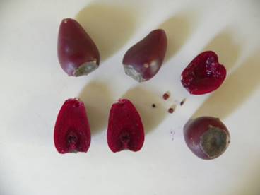comprimento, com o ápice alargado e com uma cicatriz achatada. O fruto maduro