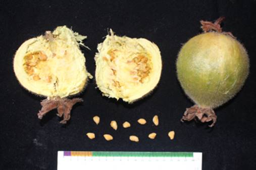 Características: Arvore de médio porte e encontrada sempre no meio da mata, onde atinge 8 a 15 m de altura; mais quando cultivada cresce de 2 a 5 m de altura, com copa piramidal e densa por causa das suas folhas grandes. O tronco é cilíndrico, medindo 10 a 35 cm de diâmetro com casca fissurada e descamante; sempre em tiras longitudinais de cor marrom ferruginoso. Az folhas são grandes obovadas (forma e ovo), com textura cartácea (de cartolina) e bulada (igual plástico bolha) e pilosa (com pelos esbranquiçados longos). A lamina foliar mede de 20 a 35 cm de comprimento por 10 a 18 cm de largura. É planta dioica, ou seja, o pé macho só dá flores aglomeradas (de 3 a 7); e o pé feminino dá 1 ou 2 flores isoladas perfeitas que geram frutas. A flor tem forma de zino de coloração verde eternamente e amarelada internamente, com 8 a 10 lobos ou recortes na extremidade. Os frutos são bagas arredondadas ou piriformes com casca marrom clara pilosa (com pelos esbranquiçados) de 8 a 12 cm de diâmetro, com polpa farinácea perto da casca e pastosa no centro onde envolve dezenas de sementes discoides e achatados, medindo de 3 a 5 mm de diâmetro. A polpa é cremosa com sabor doce indescritível que parece uma mistura de tamarindo com jenipapo e damasco seco.