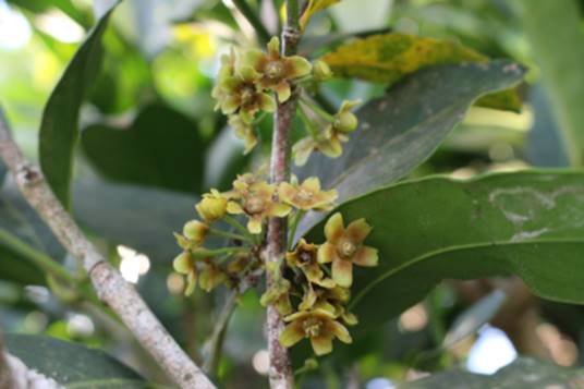 Características: Arvore de médio a grande porte, e mais raramente um cipó quando na mata, atingindo 4 a 8 metros de altura com copa arredondada e densa, com folhagem verde escura e perene. O tronco é curto e cilíndrico, com casca quase lisa e de coloração creme esbranquiçado. As folhas são opostas ou subopostas, simples, glabras (sem pelos) em ambas as faces, de textura coriácea (grossa como couro) e discolores (com 2 cores, esbranquiçada por baixo). O limbo ou tecido foliar tem forma elíptica (com mesma largura da base ao ápice), medindo 8 a 16 cm de comprimento por 3 a 6 cm de largura, com base e ápice arredondado; fixada sob pecíolo de 0,4 a 1,6 cm de comprimento. As flores são hermafroditas e nascem em fascículos (pequenos feixes) axilares (nasce nos nós maduros e desfolhados) com 12 a 30 flores de 7 a 11 mm de comprimento de cor creme esverdeada. Os frutos são bagas arredondadas, com 3 a 4,5 cm de comprimento por 3 a 5 cm de largura, com casca amarelada e mais freqüentemente alaranjada com 3 a 5 mm de espessura, envolvendo 4 a 8 sementes oblongas (mais longa que larga), envoltas por arilo cremoso de cor branca e muito doce.