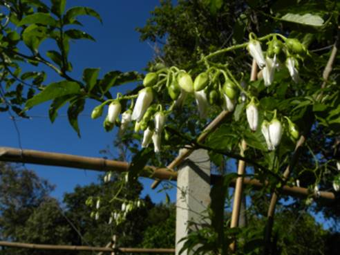 trepadeira, perene, volúvel (que se enrola), sem gavinhas,