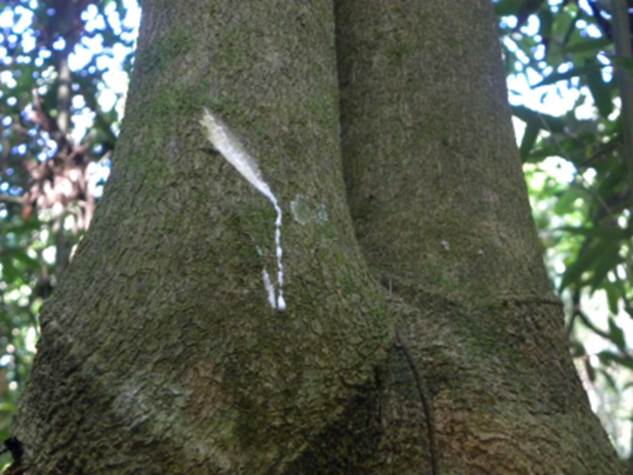 CARACTERISTICAS: Arvoreta ou arvore de pequeno porte, atingindo 3 a 10 m de altura. A copa é larga e baixa e o tronco é cilíndrico com casca fissurada no sentido vertical e coloração castanho amarelada. Essa espécie pode ser facilmente identificada por se observar o látex branco que exsuda nas partes feridas e por notar os galhos com formação em Y ou de gancho de fazer cetra. As folhas são simples, opostas, assimétricas (com um lado maior e outro menor na base), oblongas (mais longa que larga) cartáceas (como cartolina), medindo 6 a 17,5 cm de comprimento por 2,5 a 4,8 cm de largura; com base cuneada (forma de cunha) ou obliqua (arredondada) e ápice acuminado (ponta longa) ou levemente caudado. A lamina é glabra (sem pelos) em ambas as faces e levemente discolor. As flores surgem em cachos axilares de 3 a 10 cm de comprimento contendo 3 a 25 flores sob pedicelo (haste ou suporte) de 6 a 12 mm com cálice e corola tubular (semelhante a tubo) com lobos (recortes) dolabriformes (dobrados como cata-vento) de 9 a 12 mm de comprimento por 5 a 7 mm de largura de cor branca e brilhante. Os frutos são do tipo folículo (como se fosse 2 folhas com as margens coladas), muricado (com verrugas) riniforme (com forma de rim), medindo 3 a 6 cm de comprimento por 3 a 3,5 cm de largura; abrindo quando maduro, expondo arilo alaranjado sobre sementes pretas de 1 cm de comprimento por 3 a 4 mm de largura.