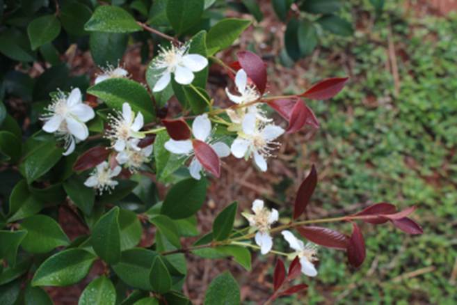 Características: Arbusto ou arvore de porte médio que cresce de 3 a 5 metros de altura, formando copa rala e arredondada. O trono é cilíndrico, tortuoso, medindo de 15 a 55 cm de diâmetro, com casca de coloração pardo amarronzada que desprende-se em placas finas e largas. Os ramos jovens e as brotações auxiliam na identificação da espécie por serem avermelhados e tomentosos (Coberto de lanugem). As folhas jovens também são vermelhas, com pecíolo (haste ou suporte) de 5 mm de comprimento que é glabrescente (sem pelos). A lamina foliar é oval ou oblonga (mais longa que larga), glabra (sem pelo quando adulta) em ambas as faces, medindo de 2,5 a 5,5 cm de comprimento por 1,5 a 2,7 cm de largura; com base atenuada (achatada) e ápice acuminado (com ponta longa). As flores nascem nas axilas das folhas em pedúnculos (haste de suporte) de 1,4 a 3,0 cm de comprimento em fascículos (feixes ou grupos) de 2 a 5 flores com sépalas rosadas e pétalas brancas de 1 cm de diâmetro quando abertas. O fruto é uma baga arredondada levemente ondulada, medindo de 0,8 a 1,2 cm de diâmetro com coloração negra quando bem madura.