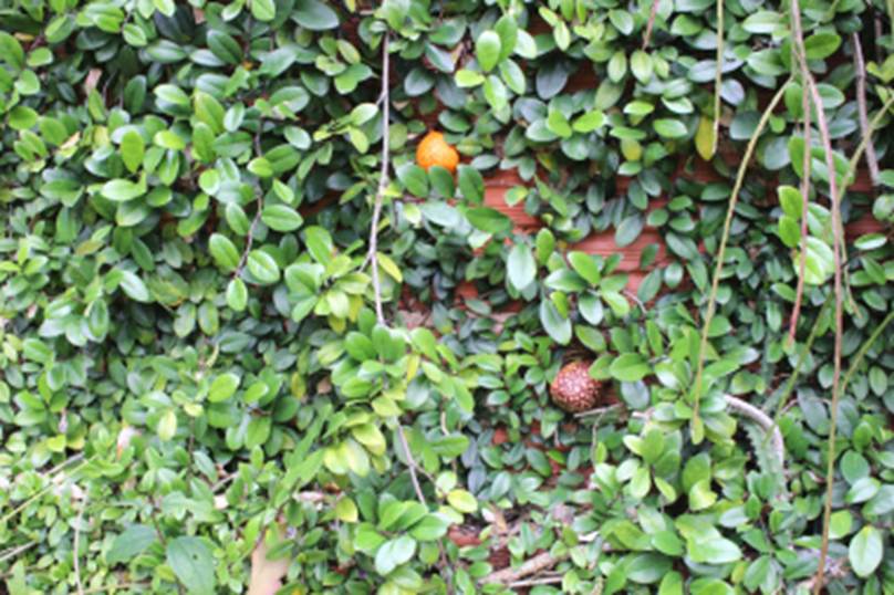 ACIMA: PLANTA REVESTINDO PAREDE COM FRUTAS ABAIXO: FRUTO BEM MADURO NO PONTO PARA FAZER DOCE |
