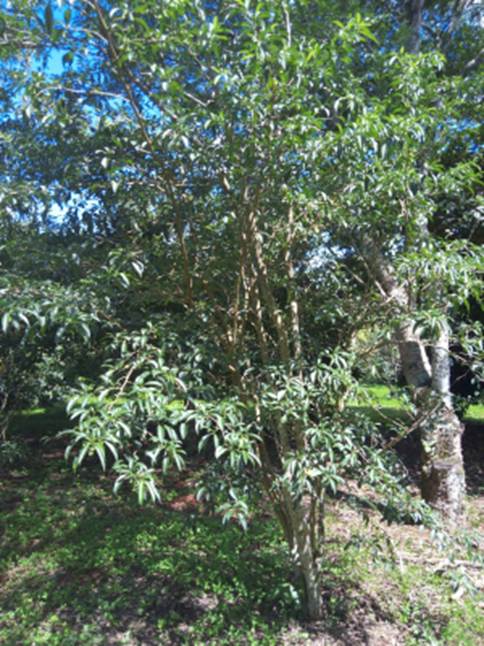 Características: Arvoreta de 2 a 5 metros de altura, com copa em forma de taça com caules múltiplos e ramos pendentes.