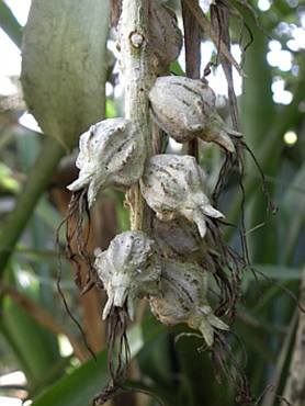 Cultivando: A medida que a planta frutifica aquela roseta que já produziu frutos, não produz mais; porem a mesma mantém a vitalidade e vai soltando rebentões que formam novas plantas produtivas. A cada 6 anos convém fazer o desbaste da touceira eliminando ou retirando as partes mortas, podendo a planta ser separada em novas mudas que podem ser plantadas em outros vasos ou sobre outras arvores.