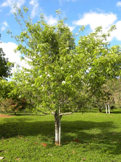 Cultivando: Fazer apenas podas de formação da copa e eliminar os galhos que nascerem na base do tronco. Adubar com composto orgânico pode ser 6 kg de matéria orgânica bem curtida + 30 g de N-P-K 10-10-10 dobrando essa quantia a cada ano até o 4ª ano.