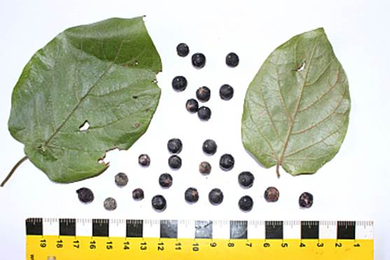 Características: Arvoreta de 2 a 7 m de altura com folhagem decídua, ramos glabros (sem pelos) e tronco maciço sendo apenas os ramos mais jovens ocos. Na primavera as folhas brotam e apresentam coloração ferruginea avermelhada. Espécie facilmente identificada por ócrea (tecido envolvente igual a sinta) de 5 a 15 mm de comprimento, de textura coriácea (rija) e borda truncada (cortada). A folha é oval, cordada (como coração) na base e ápice obtuso ou arredondado; as nervuras tem tricomas (pelos em forma de T) na face dorsal. A lamina mede 3 a 14 cm de comprimento por 2 a 7 cm de largura. A inflorescência é terminal, em tirsos (um cacho decrescente para o ápice) de 3 a 12 cm de comprimento com inúmeras flores de 2 a 3 mm de comprimento. Os frutos são perigônio (invólucro carnoso semelhante a sépalas) de 7 a 11 mm de diâmetro com coloração roxo enegrecido.