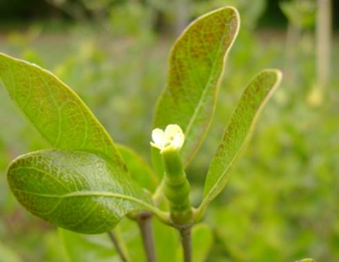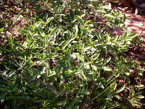 Características: arbusto pequeno de 30 a 80 cm de altura com ramos alongados crescendo rente ao chão por até 1.20 cm de diâmetro nascidas a partir dum caule com raízes xilopódias (órgão subterrâneo semelhante a uma cenoura) do qual, nutrientes são armazenados para passar o período de seca. Os ramos são ressequidos, com casca pouco áspera de cor castanha caramelada. As folhas são simples e oposta com pequenas estipula (lamina foliar) oposta aos pecíolos (haste que prende a folha ao caule) de 3 a 5 mm de comprimento. A lamina folia é coriácea (de consistência rija), glabra (sem pelos), coloração verde amarelado, brilhante em ambas as faces e vermelhadas quando brotam, medem 5 a 9 cm de comprimento por 2,5 a 4,5 cm de largura. A flor masculina tem 4 ou 5 estames (tubos que transportam o pólen) alternipétalos (entre cada pétala) grudados na corola. A flor feminina geralmente é solitária e raramente aos pares composta de ovário (órgão que se transforma em fruto) ínfero (que fica abaixo dos elementos da flor), com 2 a 5 lóculos ou cavidades multiovuladas (com muitos óvulos que transformarão em sementes). Os frutos são bagas globosas de 2 cm de comprimento por 1 a 2 cm de diâmetro pesando de 4 a 14 gramas, de casca amarronzada quando madura, com polpa marrom claro envolvendo 6 a 14 sementes planas, castanho claras de 0,4 cm de comprimento por 0,3 mm de largura.