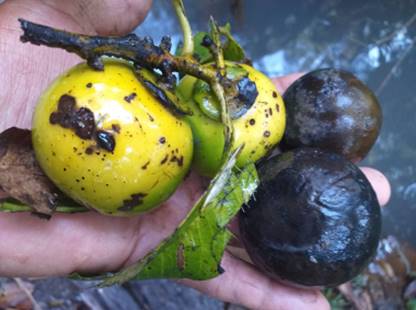 OBSERVAÇÕES: Curiosamente essa planta surgiu aqui por causa dos pássaros, pois costumo colher sementes de Sapota preta (Diopyros nigra) embaixo da arvore da mesma, o qual muitos pássaros vem comer; e após a formação das mudas, notei que 2 delas eram bem diferentes, separei do lote para mim plantar. Após 1 ano consegui sementes com um amigo de Goiás e por incrível que pareça nasceram plantas idênticas as 2 mudas que separei. Então aqui na minha região perdido em alguma mata esta espécie também ocorre e os pássaros trouxeram elas para mim plantar. As fotos acima foram cedidas pelo amigo Salvador Alves da Conceição.