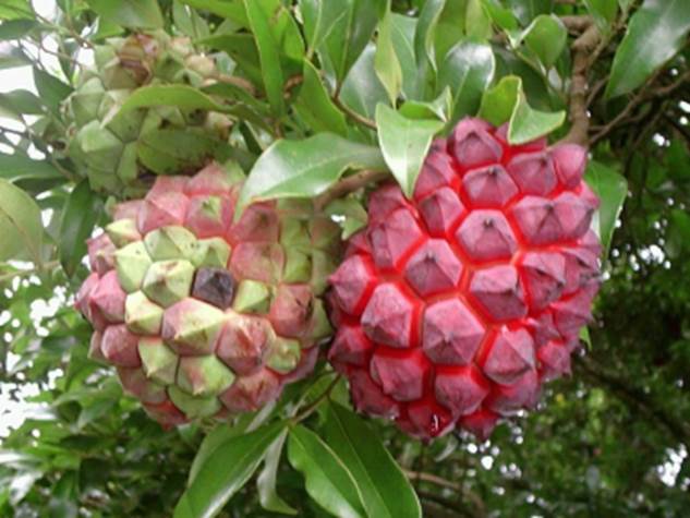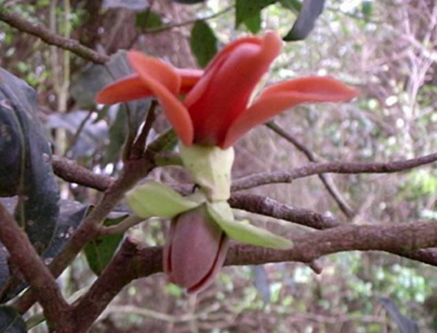 Características: Arvore esbelta e elegante que cresce até 15 ou 20 metros na mata e seu fuste ou tronco é reto e tem casca de cor marrom-acinzentada e chega a medir 40 cm a 60 cm de diâmetro. As folhas são simples, glabras (sem pelos), esbranquiçadas e escamosas na face inferior; lanceoladas (com forma de lança), com margem lisa e textura cartácea (como papel cartolina), medem de 2,5 cm a 3 cm de largura e 6 cm a 12 cm de comprimento. A lamina foliar tem cor verde-amarelada quando jovem e verde escura quando se torna mais velha, estas têm perfume aromático que poderia ser explorado pela indústria. As flores são hermafroditas, dispostas em curtos racemos (pequenos cachos com 2 ou 3 botões), são hemiciclicas, ou seja, os segmentos ou pétalas se prendem num mesmo nó ou estão distribuídas em espiral. Dotadas de bractéolas (pequenas laminas de proteção) amplexicaules (que abraça o caule) abaixo do cálice. O cálice (invólucro externo) é solto com 3 sépalas livres e a corola (invólucro interno) tem  5 ou 6 pétalas glabras (sem pelos) de cor rosa ou avermelhada. Os frutos são sincarpios (conjunto de segmentos ou gomos) distribuídos como raios a partir dum eixo central, medem até 8 cm de diâmetro, tem casca com laivos ( veios ou reentrâncias) amarelo ferrugíneos quando começam a amadurecer.