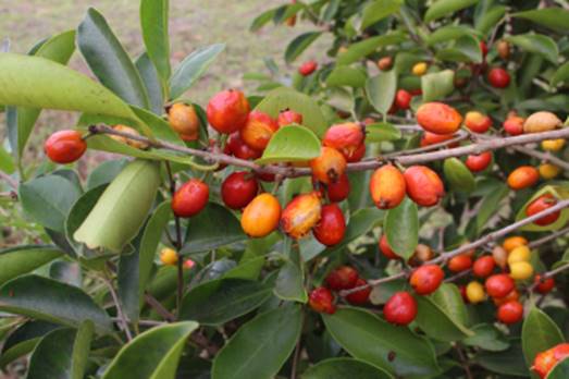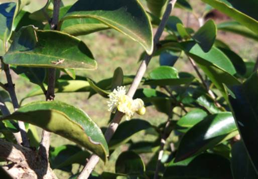 Características: arvore de 2 a 4 metros (ou até 10 m quando na mata) com copa cilíndrica, compacta e de folhagem perene, o troco é curto e cilíndrico, com casca acinzentada e de textura áspera a rugosa quando a arvore fica mais velha. As folhas são inteiras, de cor verde enegrecido e brilhante, opostas e glabras (sem pelos) com pecíolo ou cabinho de 6 a 9 mm de comprimento. A lamina tem textura coriácea (como couro), ovada (com forma de ovo) e oblonga (mais longa que larga) medindo 5 a 19 cm de comprimento por 2 a 3,5 cm de largura. As flores nascem nos ramos maduros em grupos de 3 a 5, são cíclicas (distribuídos em vários ciclos), diclamídeas (com dois envoltórios) e medem 1,5 cm de diâmetro quando abertas. Estas tem cálice (invólucro externo da flor) cupulado (com forma de cúpula) com 4 sépalas livres de 8 mm de comprimento e corola (invólucro esterno) com 4 pétalas brancas. Os frutos são subglobosos ou cilíndricos, medindo 1,5 a 1,8 cm de comprimento por 8 mm a 1,4 cm de largura, com pele fina vermelha envolvendo polpa gelatinosa avermelhada que recobre uma semente arredondada de cor acinzentada.