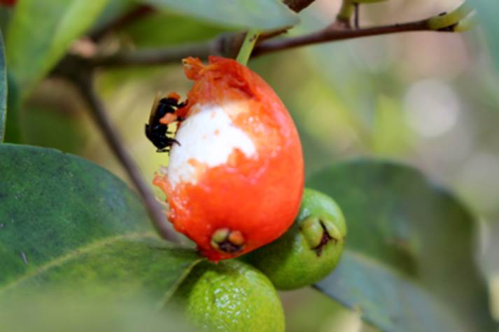 FRUTO SENDO CARREGADO PELA ABELHA GUIRUÇÚ |