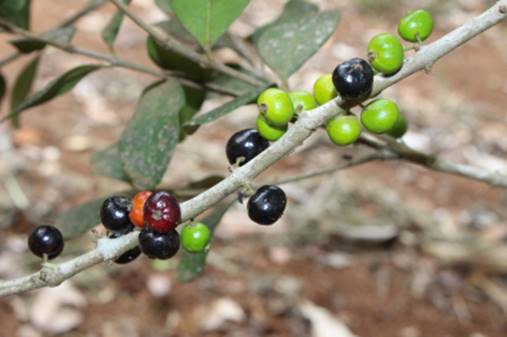 Características: Arvoreta de 3 a 6 m de altura, com copa arredondada e rala de 2 a 3 m de diâmetro, folhagem perene, ramagem abundante e elliptica (arrumada verticalmente). O trono é curto e múltiplo, com casca rugosa e de coloração pardacenta, descamando em tiras irregularess. As folhas são opostas, coriáceas (textura de couro), verde clara, sob pecíolo (haste ou suporte) de 4 a 5 mm de comprimento. A lamina foliar é oblonga (mais longa que larga) e obocada (com forma de ovo, mais com o ápice largo), medindo 4 a 6 cm de comprimento por 1,5 a 3,2 cm de largura, com base agudo e ápice obtuso. As flores nascem nos ramos maduros sem folhas em curtos racemos (tipo da cacho) com 2 a 8 flores que quando abertas medem 7 a 10 mm de diâmetro e tem 4 pétalas ovadas de 3 a 4 mm de comprimento. Os frutos são drupas oblatas (esfera achatada) de cor vermelha e depois roxa e totalmente preta quando madura, medindo 9 a 13 mm de diâmetro, podendo ser consumida com casca e tudo, jogando só 1 semente arredondada por fruto de 4 a 6 mm de diâmetro.