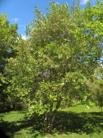 Características: Arbusto de 1 a 3 m de altura na restinga, podendo atingir até 20 m de altura na floresta; com copa arredondada ou mais ou menos piramidal. O tronco mede 10 a 30 cm de diâmetro com casca pardo acinzentada que se desprende em escamas desuniformes. As folhas são simples, cartáceas (como cartolina), glabras (sem pelos) e discolores, sendo verde marcante na face superior e verde amarelada na face inferior ou dorsal. A lamina é larga com base afunilada e ápice obtuso apiculado (arredondado com pequena ponta), medindo 3 a 5,5 cm de comprimento por 2 a 3 cm de largura. As flores são solitárias, axilares, brancas com estames (tubos masculinos) e anteras (glândulas que carregam os grãos de pólen) amarelas. O fruto é uma drupa monosperma (com uma semente) de coloração amarelada com 1,5 a 2,5 cm de diâmetro.