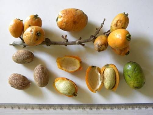 Características: Arvore de 3 a 5 m de altura quando cultivada, mais na mata atinge 10 a 25 m de altura. O tronco é reto de cor castanho claro de 30 a 40 cm de diâmetro e a casca é descamante em placas irregulares, verticais e longas. A copa é ramificada e arredondada. As folhas são simples, opostas de textura cartácea (como cartolina), glabras (sem pelos) em ambas as faces, medindo 5 a 9 cm de comprimento por 2 a 3,4 cm de largura, sob pecíolo (haste ou suporte) de até 2 cm de comprimento e caniculado (como calha). A lamina têm coloração verde clara, a base é arredondada e ápice atenuado (que se afina gradativamente). As flores nascem nos ramos desfolhados e fascículos (pequenos feixes). Eu não observei as flores por isso não posso descrevê-las. Os frutos são bagas monospermas (com uma semente) de 3,5 a 5 cm de comprimento por 2,5 a 3,5 cm de largura e pericarpo (polpa) amarelo alaranjada de 4 a 6 mm de espessura envolvendo 1 semente oblongada de 1,5 a 2,3 cm de comprimento.