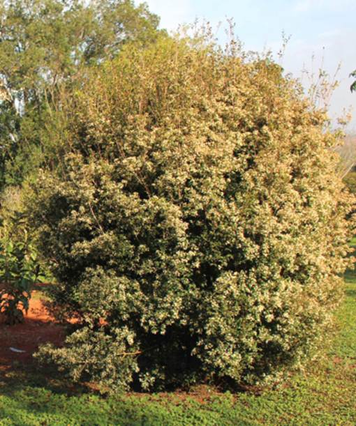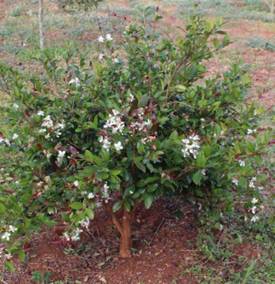 Características: Arbusto ou arvore de porte médio que cresce de 3 a 5 metros de altura, formando copa rala e arredondada. O trono é cilíndrico, tortuoso, medindo de 15 a 55 cm de diâmetro, com casca de coloração pardo amarronzada que desprende-se em placas finas e largas. Os ramos jovens e as brotações auxiliam na identificação da espécie por serem avermelhados e tomentosos (Coberto de lanugem). As folhas jovens também são vermelhas, com pecíolo (haste ou suporte) de 5 mm de comprimento que é glabrescente (sem pelos). A lamina foliar é oval ou oblonga (mais longa que larga), glabra (sem pelo quando adulta) em ambas as faces, medindo de 2,5 a 5,5 cm de comprimento por 1,5 a 2,7 cm de largura; com base atenuada (achatada) e ápice acuminado (com ponta longa). As flores nascem nas axilas das folhas em pedúnculos (haste de suporte) de 1,4 a 3,0 cm de comprimento em fascículos (feixes ou grupos) de 2 a 5 flores com sépalas rosadas e pétalas brancas de 1 cm de diâmetro quando abertas. O fruto é uma baga arredondada levemente ondulada, medindo de 0,8 a 1,2 cm de diâmetro com coloração negra quando bem madura.