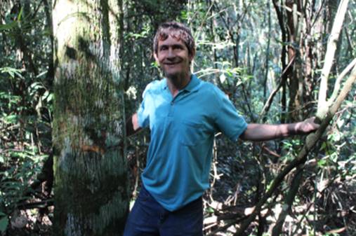 Foto acima: Helton Josué autor do projeto Colecionando frutas ao lado do tronco de uma magnifica Bicuiba (Vitrola bicuyba) cujo arilo que envolve a semente é comestível e a semente pode ser usada como condimento em pratos salgados.  Essa espécie também é chamada de Fruta de Araponga e de fato a Araponga estava brava no alto na copa da árvore enquanto eu e meu amigo Joaquim andávamos nas proximidades da árvore.