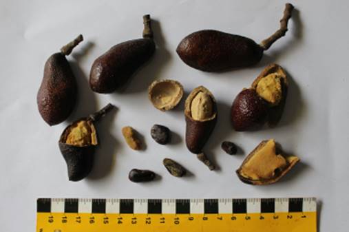 Abaixo estão fotos das cascas da semente e folhas da Tanimbuca amarela ou Tanimbuca ameixa (Buchenavia rabelloana) e a sapobemba e tronco dessa rara espécie que corre o perigo de extinção. Conseguimos encontrar algumas plântulas recém germinadas debaixo da planta mae e agora já temos 2 plantas bem estabelecidas no pomar do sitio Frutas raras (Agora no mês de julho de 2.019 quando eu publiquei o relatório de expedições de 2.018) Veja as fotos abaixo: