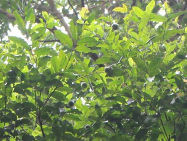 Tronco de Eugenia excelsa acima e copa com alguns frutos verdes abaixo