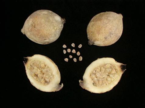Mudas: Sementes são discóides e planas e após despolpadas, limpas e secas conservam o poder germinativo por até 1 ano se guardadas em local escuro.