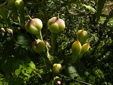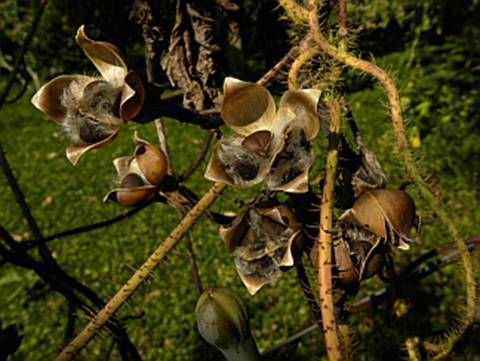 Usos: Frutifica nos meses de Abril a Maio. Em chácaras ou jardim a planta pode ser conduzida sobre estruturas semelhantes a quiosques com armação de arames visando uma bela cobertura natural visando produzir sombra somente no verão. Também pode ser plantada em quintais de grandes cidades na beira de muros onde se pode fazer uma malha de arame para tutorar a planta que é de grande beleza quando em floração. Para utilizar os frutos é preciso colhe-los quando iniciar a abertura espontânea das cápsulas. Depois, as sementes devem ser postas para secar no sol por 1 dia inteiro, após isso, as sementes podem ser torradas e moídas para fazer um tipo de bebida semelhante ao café.