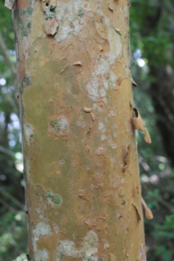 CARACTERISTICAS: Árvore de porte médio que cresce de 5 a 18 metros de altura, formando copa cilíndrica quando na mata ou arredondada quando em sol pleno. O trono é cilíndrico, medindo de 15 a 40 cm de diâmetro, com coloração creme amarelado; com casca desprende-se em placas laminares deixando o tronco com mosaicos esverdeados. As folhas são simples, opostas, cartáceas (textura de cartolina), de cor verde escura e brilhante em cima e opacas por baixo, medindo de 4 a 6 cm de comprimento por 1,3 a 1,9 cm de largura, com forma oblonga (mais longa que larga) com base e ápice apiculado (com ponta curta). As flores nascem nas axilas das folhas em dicásios com 3,5 a 5,5 cm de comprimento, com 3 flores no ápice de 1,3 cm de diâmetro quando abertas. com pétalas e estames brancos. O fruto é uma baga obovada (forma de ovo invertido) medindo de 1,2 a 1,8 cm de diâmetro por 0,5 a 0,9 cm de altura de cor alaranjada quando madura envolvendo uma semente pequena e esverdeada.