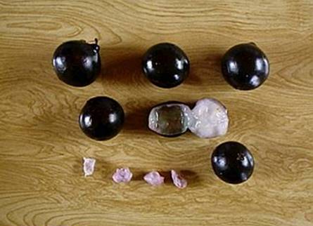 FRUTO MADURO DE JABUTICABA APIMENTADA OBSERVAÇÕES: Acima (2 fotos a esquerda) a rara variedade de jabuticaba encontrada em estado nativo nos arredores de Angatuba SP, onde é preservada num terreno de uma chácara próximo de um ribeirão onde o solo é do tipo piçarra. A arvore é muito semelhante a Jabuticaba Sabará (Myrciaria ou Plinia cauliflora) porém as folhas são maiores e o caule é cinza metálico. É planta completamente decídua (perde todas as folhas no inverno) e frutifica em fins de novembro e dezembro. Os frutos são grandes (3 cm) polpa branca, doce com 1 ou no máximo 2 sementes grandes. A polpa é doce agradável no inicio mais no final deixa um sabor apimentado nas papilas gustativas. Muito interessante. Temos mudas dessa raridade.
