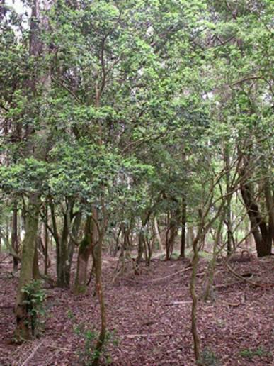 Características: Arvore pequena de sub-bosque que atinge 3 a 4 metros de altura, com ramos e galhos esparsos formando copa rala, o tronco é reto e liso com 8 a 20 cm de diâmetro, de casca descamante no sentido longitudinal, com cor avermelhada e opaca. A ponta dos ramos novos é avermelhada após a brotação. As folhas são simples, opostas e glabras (sem pelos) com pecíolo ou haste de 3 a 4 mm de comprimento. O limbo ou tecido foliar é de textura cartácea (como cartolina) e mede 3 a 4 cm de comprimento por 0,8 a 1,8 cm de largura, tem forma obovóide (forma de ovo, com a parte larga voltada para baixo) e ápice ou ponta acuminado (ponta longa e comprida). As flores são hermafroditas e nascem em grupos de 3 a 5 nos glomérulos (tipo de cimeira ou cacho multíparo com flores condensadas) axilares (na base ou encontro da folha com o ramo). As flores individuais são minúsculas, diclamídeas (com dois envoltórios), com bractéolas (folha modificada e reduzida) conatas (concrescidas) no terço inferior do botão floral; constituídas de: cálice (invólucro externo) com 5 sépalas unidas e corola (invólucro interno) com 5 pétalas brancas, livres de 3 mm de comprimento e glabras (sem pelos). Os frutos são bagas ovóides vermelhas, alaranjadas ou amarelas de 0,6 a 1,2 cm de diâmetro, com casca bastante fina de cor vermelha ou púrpura, com arilo alaranjado envolvendo de uma a três sementes reniformes (com forma de rim), muito pequenas e esverdeadas.