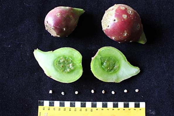 Usos: Frutos maduros de agosto a dezembro. Frutos maduros tem cor vermelha e a casca tem pequeninos espinhos nas aréolas, e por isso recomendo colher com um pegador de carne ou luva de couro, colocar numa caixa vasada e com uma vassoura varrer revirando os frutos para sair os espinhos, depois enxaguar em agua corrente para limpeza total. Após este processo p frutos podem ser descascados ou cortados no meio, para consumo in natura, ou em saladas ou ainda, os frutos mais verdes têm diversos usos em pratos salgados. A polpa muito deliciosa e refrescante tendo gosto de pera com kiwi. A planta é cultivada como ornamental e como cerca viva, mais tem grande potencial como frutífera comercial pois seus frutos são resistentes, com duração de prateleira recorde de 3 meses, além de serem muito saborosos e muito nutritivos.