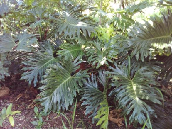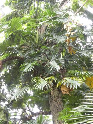 CARACTERISTICAS: é um arbusto de até 3,5 m de altura quando plantado no solo, formando colônias ou moitas por causa do habito de formar um caule monopodial (que se desenvolve pela brotação de uma única gema) ereto que à medida que cresce inclina-se até encostar no chão, enraizando e voltando a crescer verticalmente. Quando cresce como epífita na forquilha das arvores, cresce até 1 m de altura e solta varias raízes grampiformes (com cabeleiras ou raízes fininhas adesivas) que chegam a atingir o solo. O caule é semi-lenhoso, flageliformes (com fibras flexíveis que tem a capacidade de deslocar a posição do meristema ou tecido vivo que tem capacidade de multiplicar-se por divisão de células) com 1 a 2 m de cumprimento por 06 a 18 cm de diâmetro, na maioria das vezes recurvado e com a superfície rústica, amarronzada e marcada como que por malhas de rede de pescar por causa da cicatriz deixada pela queda das folhas, e na maioria das vezes nascem raízes grossas em direção ao solo. Quando a planta é jovem, o pecíolo (haste ou suporte) envolve o caule na base que é uma bainha (tecido achatado na forma de envoltório), este é comprido, atingindo de 60 a 150 cm de comprimento, é circular, afunilando-se para o ápice, com espessura de 2,5 a 4,5 cm de diâmetro. A folha é peltada (o pecíolo é inserido no meio da lamina foliar, pelo dorso), alternas, concentrada no ápice do caule, radiada (distribuída) em todas as direções, glabras (sem pelos), brilhantes na pagina superior e verde-glauca (verde claro esbranquiçado) na pagina inferior. A lamina foliar é pinatifida (com nervação pinada, cujas bordas são recortadas de forma que a fenda adentra alem da metade da folha), com base hastada (com os lobos ou recortes basais pontiagudos e divergentes) e ápice acuminado (com ponta longa), medindo de 50 a 85 cm de comprimento por 35 a 55 cm de largura. A inflorescência é axilar, na forma de espádice (com eixo carnoso na forma de uma espiga), protegida por uma espata (bráctea ou tecido modificado) oval, coriácea (consistência rija) de 15 a 24 cm de comprimento e 0,4 a 0,8 mm de espessura, de coloração esverdeada externamente e creme ou acastanhada internamente. Os frutos são bagas agregadas, ou seja, unidas lado a lado numa espiga ou eixo central de 15 a 25 cm de comprimento por 5 a 7 cm de diâmetro e a espata é persistente até o amadurecimento do fruto.