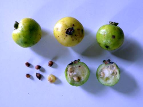 bagas arredondadas de 4 a 5 cm de diâmetro com casca amarela, tendo no ápice
