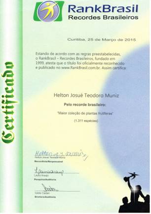 A Maior coleção de plantas frutíferas do país, recorde registrado pelo RankBrasil em 2015, pertence a Helton Josué Teodoro Muniz. No sítio Frutas Raras, localizado em Campina do Monte Alegre (SP), ele cultiva 1.311 espécies agrupadas em quase 100 famílias botânicas.