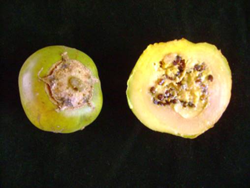 diâmetro por 5 a 8 cm de altura com polpa esverdeada e sementes pretas,