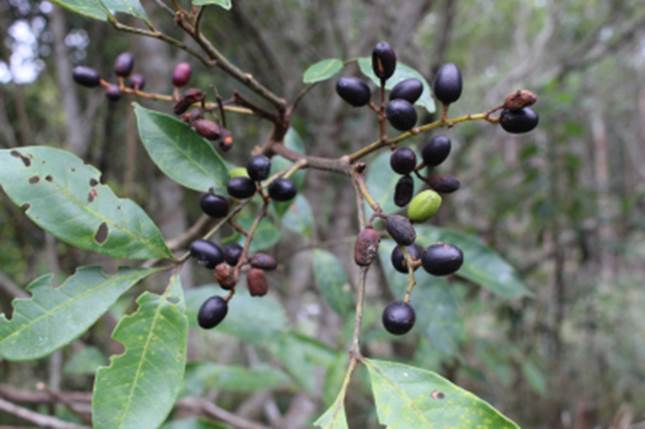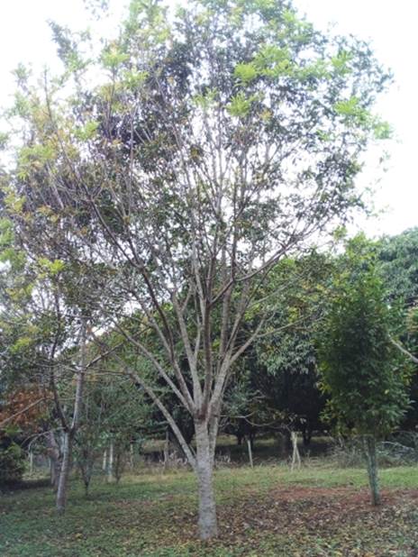 CARACTERISTICAS: A arvore na floresta amazônica pode atingir 20 metros de altura, mais na floresta atlântica do sul raramente atinge 10 m. A copa é cônica e globosa no ápice, com ramos galhos ascendentes. O tronco é reto com fuste (comprimento da tora) curto, de 3 a 5 m de comprimento por 40-60 cm de diâmetro, com casca rugosa, espessa e fissurada (com cortes) no sentido longitudinal; tendo coloração amarronzada. As folhas são compostas imparipinadas (com forma de pena, mais que termina com um folíolo), a raque ou eixo central mede de 12 a 30 cm e por ele se distribuem em média 2 a 7 pares de folíolos (folha única) com textura subcoriácea (rija e grossa), discolores (com 2 cores), glabros (sem pelos) na face superior e pubescentes (com pelinhos) nas nervuras dorsais. A lamina tem forma oblonga (mais longa que larga) e medem 8 a 13 cm de comprimento por 3 a 5 cm de largura, a base é cuneada (com forma de cunha) e o ápice é apiculado (termina em ponta curta). As flores nascem em panículas (tipo de cacho composto com forma piramidal) axilares (na junção do ramo com a raque), com 08 a 20 cm de comprimento, chegando a ter mais de 100 flores prateadas, com 2 a 3 mm de comprimento. Os frutos são drupas (com uma semente), medindo de 1,2 a 1,7 mm de comprimento por 1 a 1,3 cm de largura, com casca fina, avermelhada escura quando totalmente madura. O arilo que envolve a semente é translúcido e gelatinoso, doce e desprende-se facilmente da semente.